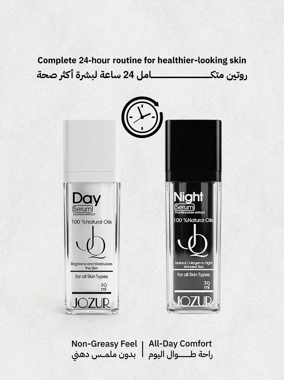 Day & Night Serum Routine is a complete 24-hour skincare system designed to hydrate, protect, and renew the skin around the clock. The daytime formula helps shield and brighten the skin, while the nighttime treatment works deeply to repair, nourish, and support natural collagen production. With consistent use, skin appears smoother, more even-toned, and visibly more radiant.